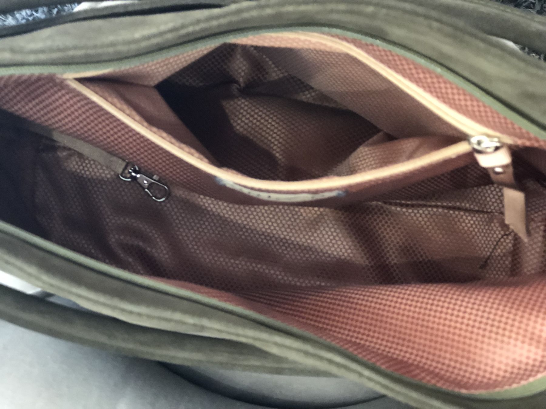 Sac type Tote Zpolop de la marque espagnole UNISA en cuir daim kaki et cuir lisse noir. un côté avec du matelassé et le rever avec des poches. Il est composé d'une pochette intérieur avec des fermetures éclair et une bade avec mousqueton pour les clés. Anses.