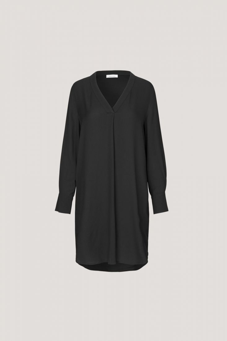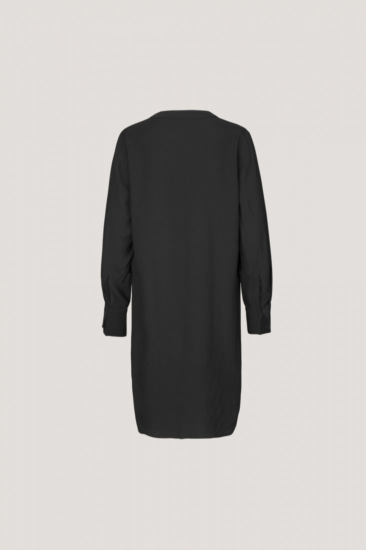 Un pli sur le devant contribue à la coupe décontractée de cette robe noire, complétée par une ligne d'ourlet légèrement incurvée.