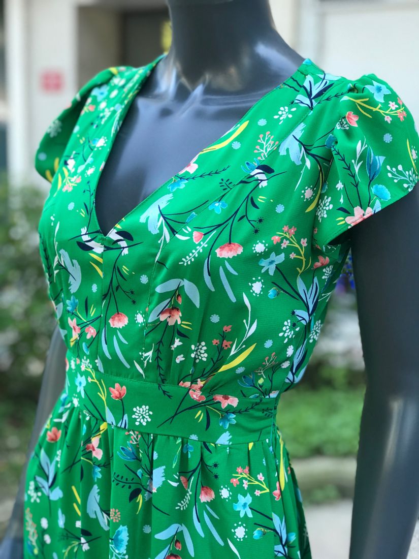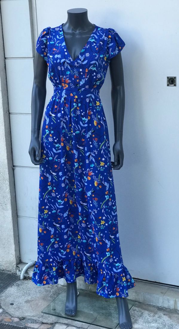 BLEU ET VERT avec un bel imprimé, idéale pour cet été. Portez cette robe de façon décontracter avec une paire de