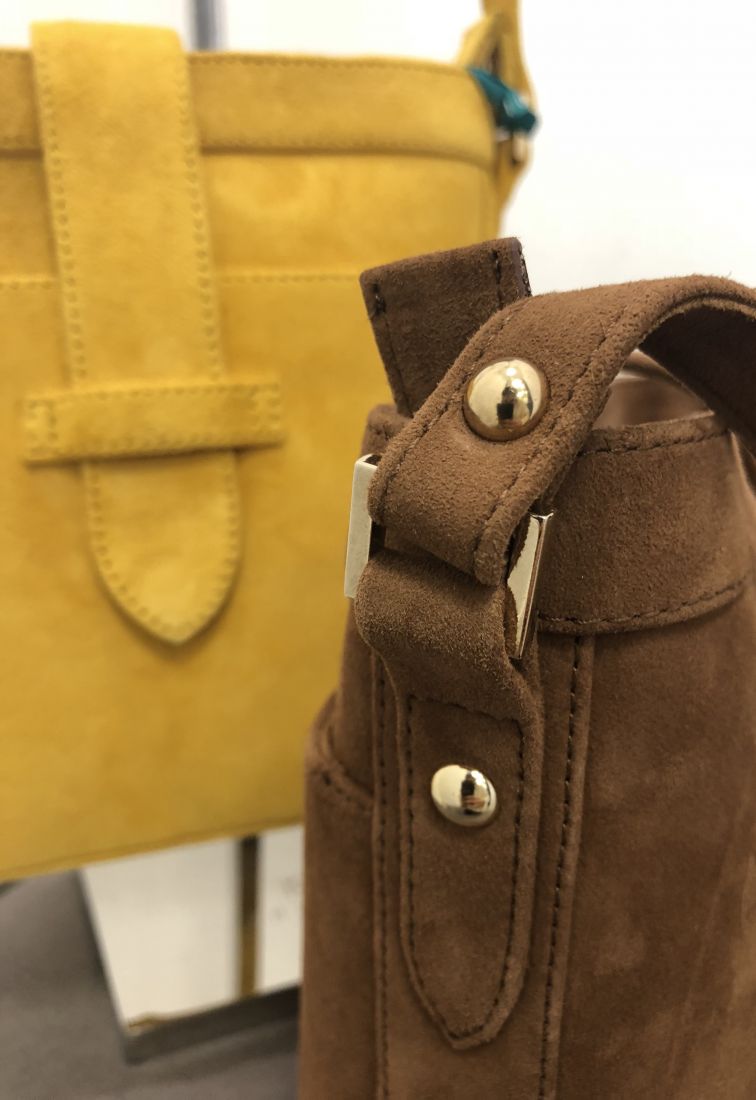 Ce sac seau Kamel & Moutarde Daim dispose de multiple rangements intérieurs et extérieurs.