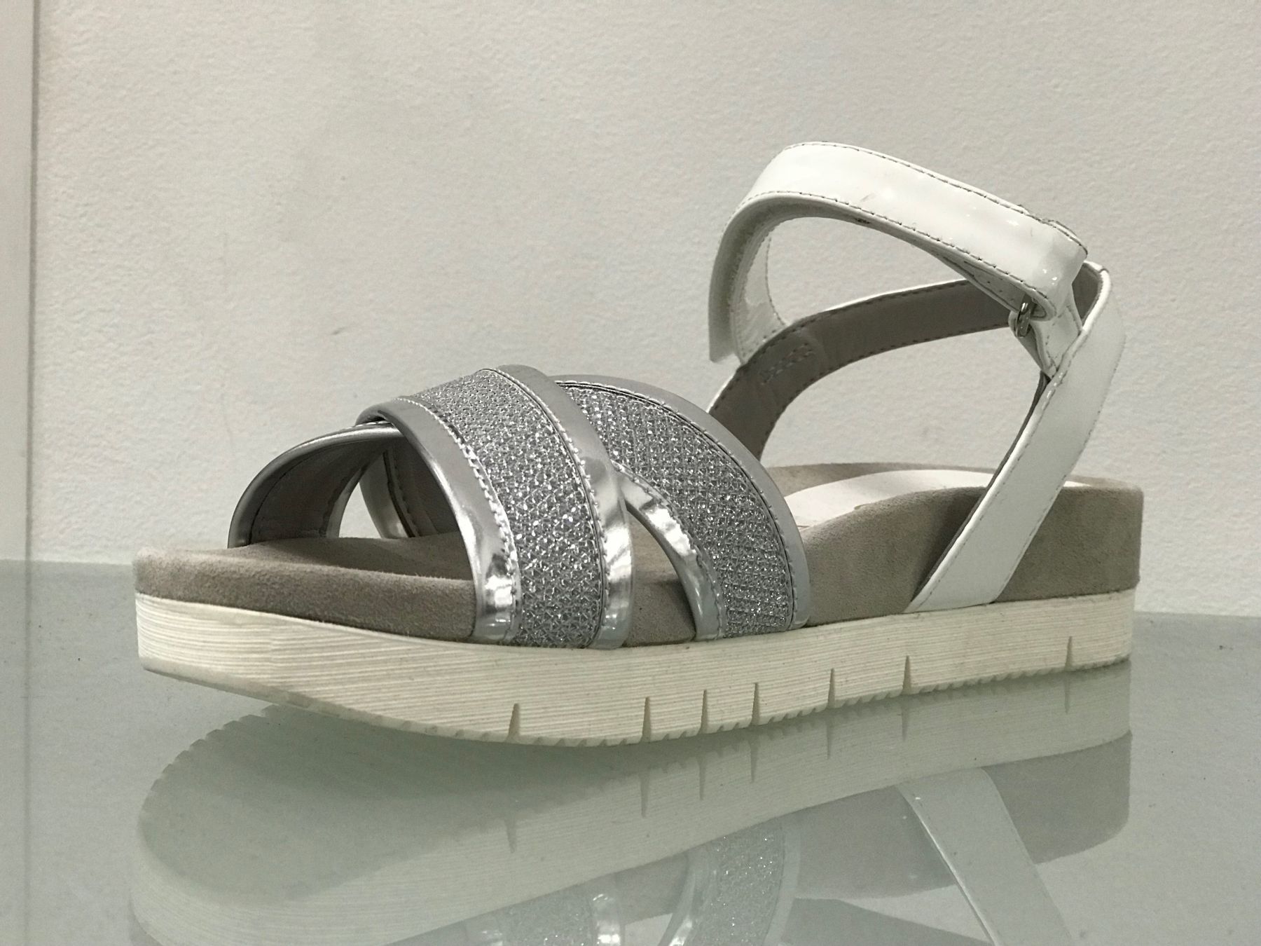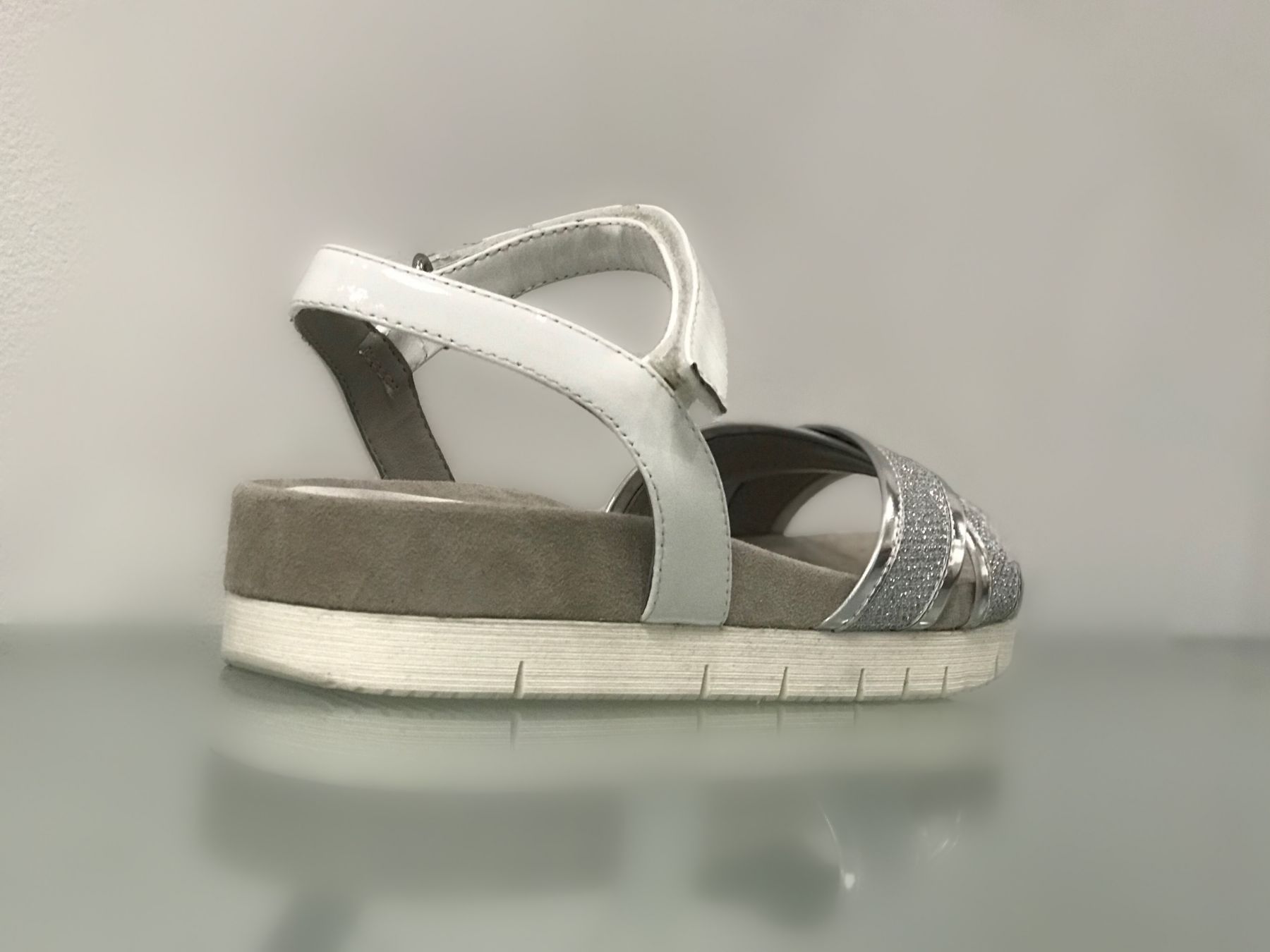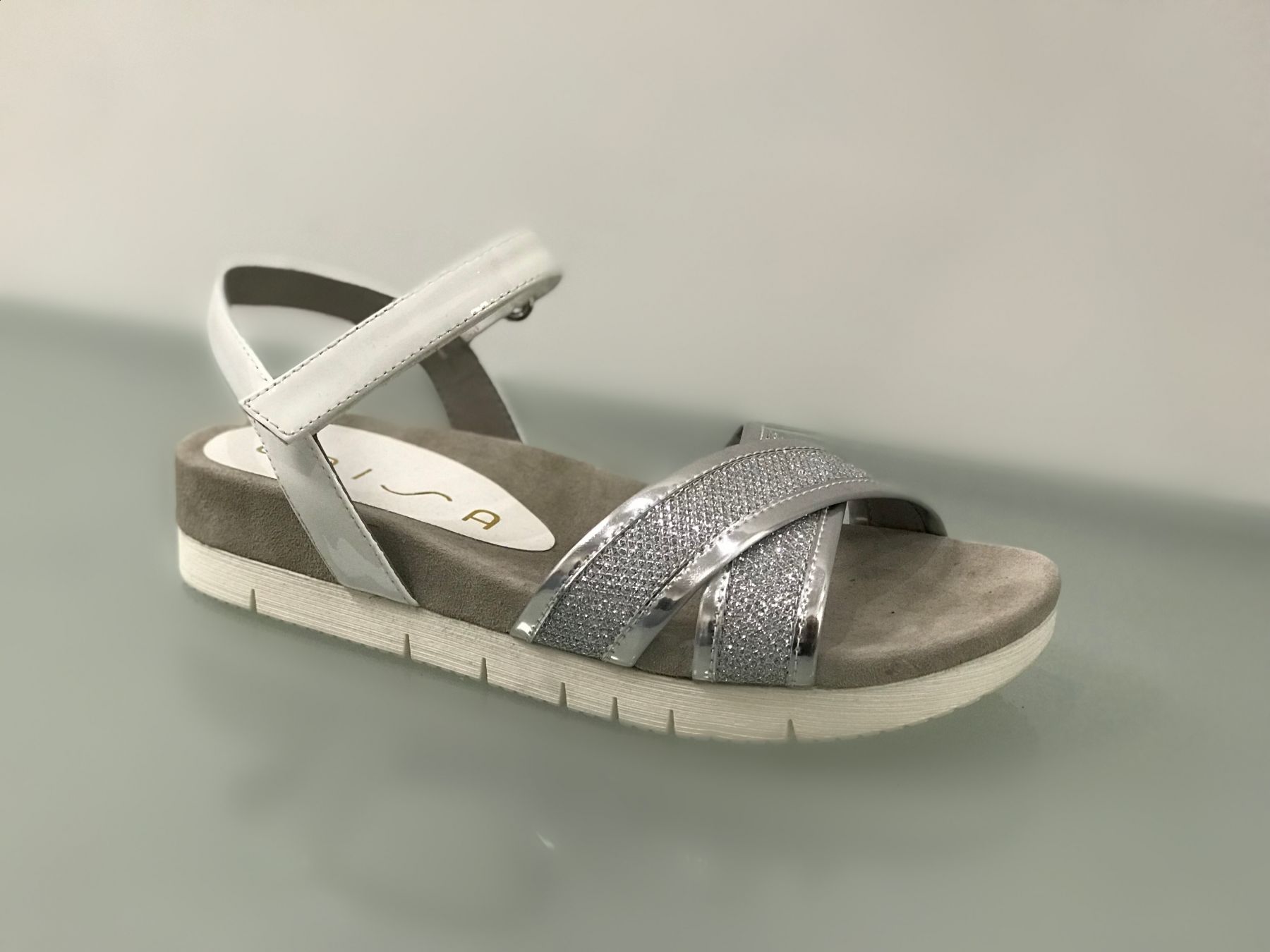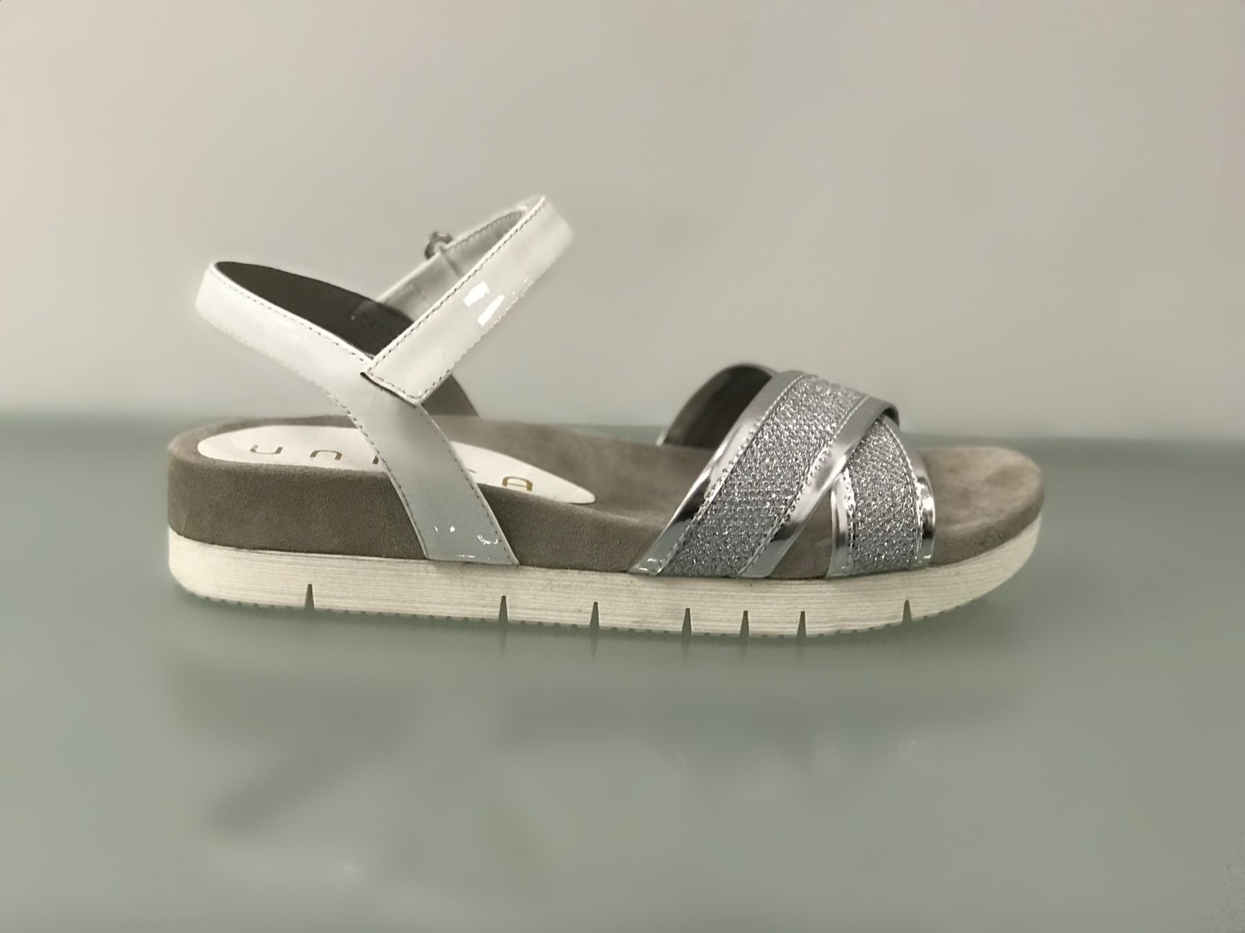 La sandale couleur argent avec bande croisée en tissu gravé et bordure vernis à l'avant du pied.